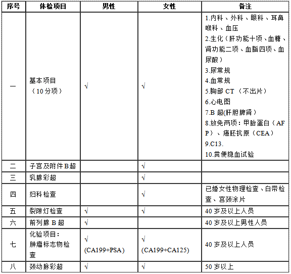 9.裂隙灯检查及男性前列腺B超检查的对象为40岁及以上人员;化验项目肿瘤标志物检查对象为40岁及以上人员,随常规检查抽血一次完成。(40岁及以上的人员,即1986年12月31日及以前出生者)