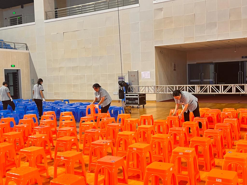 为开学典礼提供优质的会场服务是场馆会务中心每年承担的重要任务,中心始终坚持精益求精的工作态度,在接到服务任务后积极与校办、团委、学生处等部门沟通,确认典礼需求,不断细化服务方案;开展场馆内外卫生清洁工作,创造优美场馆环境;实时掌握现场电力设备运转情况,确保电力供应稳定;协同完成主席台布置与物资调配,保障茶水服务;加大卫生清扫和垃圾清运力度,维护活动秩序。第一场本科生开学典礼刚结束,场馆会务中心便争分夺秒地投入转场工作,高效完成了场地的重新布置,保证第二场研究生开学典礼按时举行。活动结束后,工作人员及时完成学生撤场、卫生清洁等收尾工作,不影响场馆的正常使用。