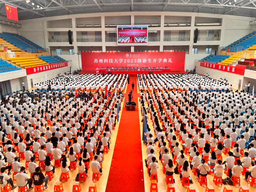 秋风为序启征程,奋楫扬帆谱新篇。9月17日上午,苏州科技大学2025级新生开学典礼在石湖校区体育馆隆重举行,7600余名新生青春飞扬,饱含活力与期待。本次开学典礼分为本科生和研究生两场,于当天上午先后举行。场馆会务中心提前部署、精心组织,认真做好场地座椅布置、环境卫生、贵宾室服务等保障工作。